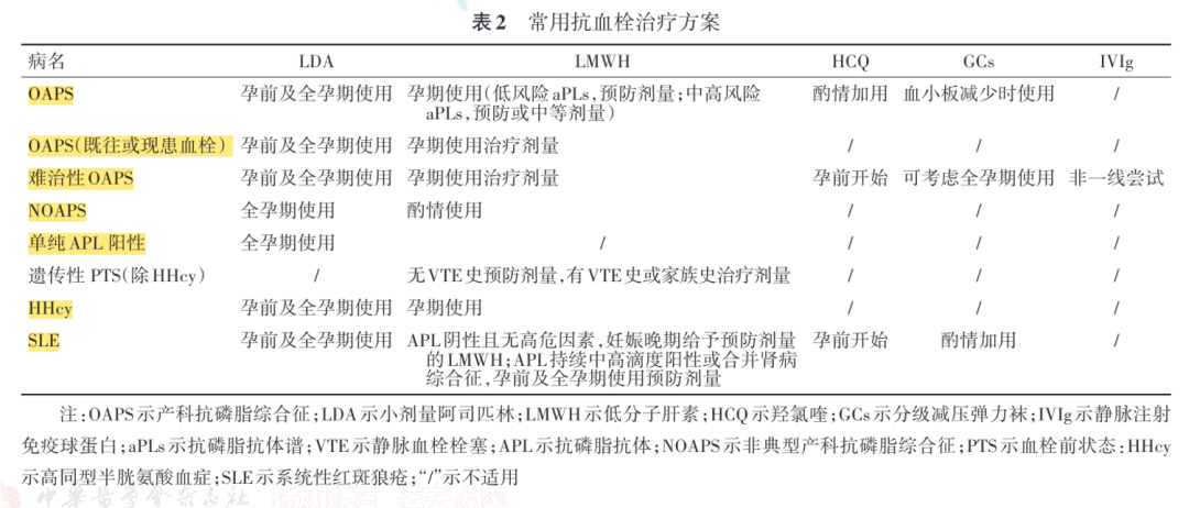 低分子肝素(LMWH)联合低剂量阿司匹林(LDA,low-dose aspirin,50~100mg/d)是目前妊娠期抗血栓治疗的首选用药方案。